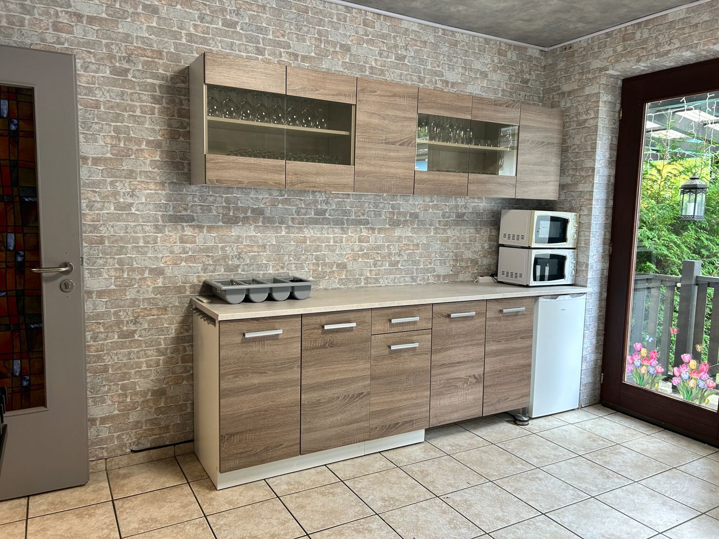 Im Untergeschoss befindet sich eine große Küche mit Arbeitsflächen rundum, die sich daher auch hervorragend als Buffet eignet und komplett ausgestattet ist mit: