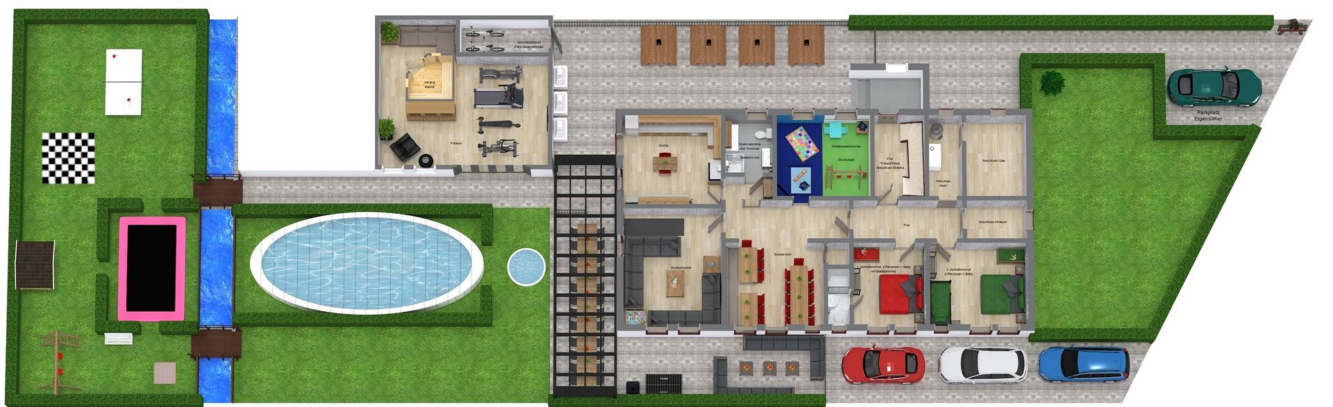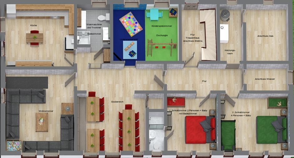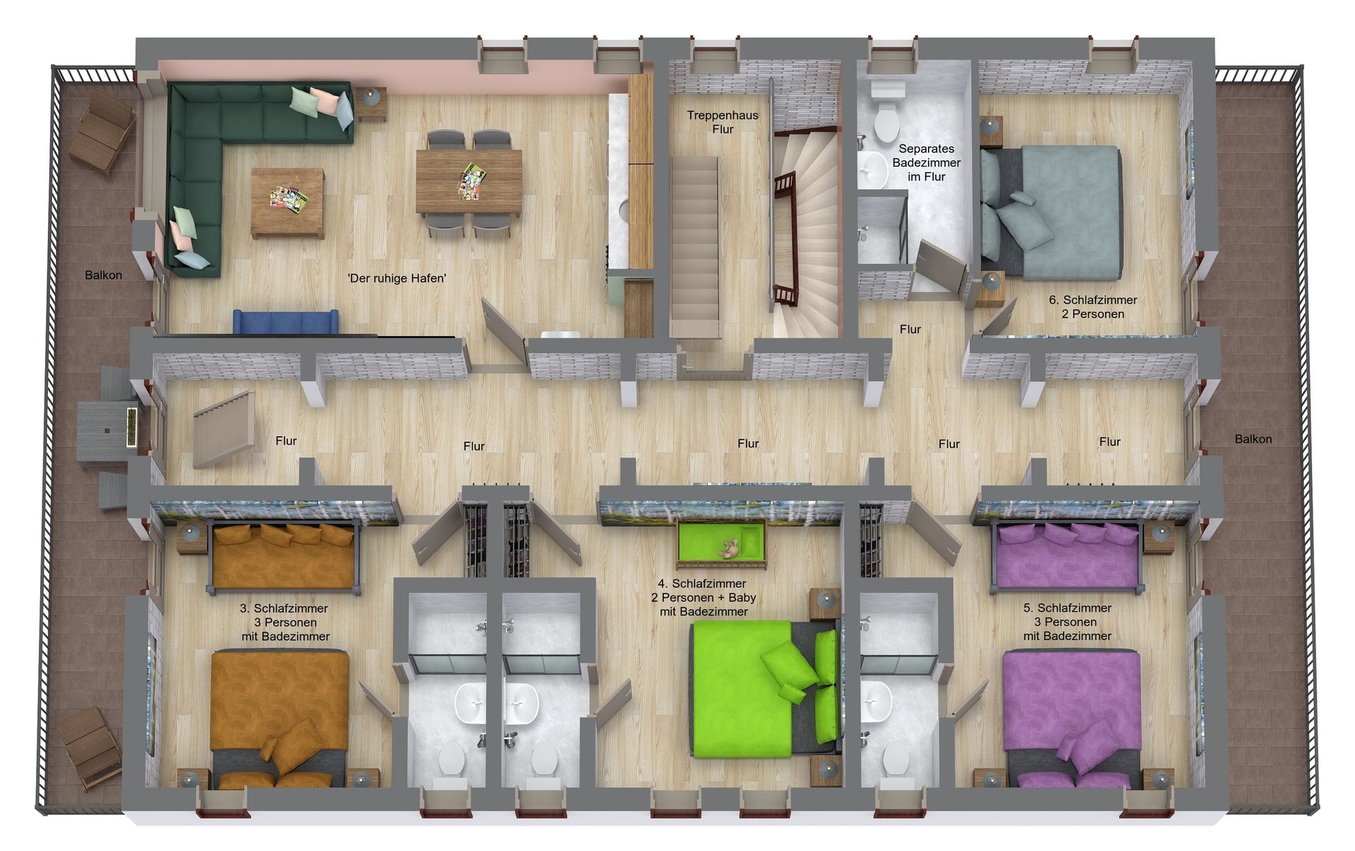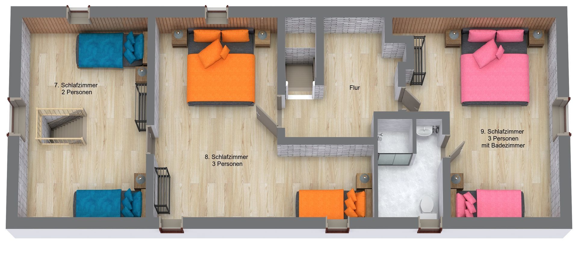 Wir zeigen hier die virtuellen Grundrisse von Klein Holland Harz. Natürlich haben wir unser Bestes getan, um diese virtuelle Darstellung so realistisch wie möglich zu gestalten. Aufgrund der Verwendung einer voreingestellten Zubehörbibliothek können die angezeigten Formen, Farben, Abmessungen und andere Details jedoch von dem tatsächlich vorhandenen Zubehör abweichen. Es sollte außerdem berücksichtigt werden, dass die Software keine schrägen Wände darstellen kann, in Wirklichkeit hat das Dach ab etwa 1/3 des Obergeschosses eine Neigung. Es können daher keine Ansprüche auf Rückerstattung oder ähnliches aufgrund von Unterschieden zwischen der virtuellen Darstellung und der tatsächlichen Einrichtung geltend gemacht werden.