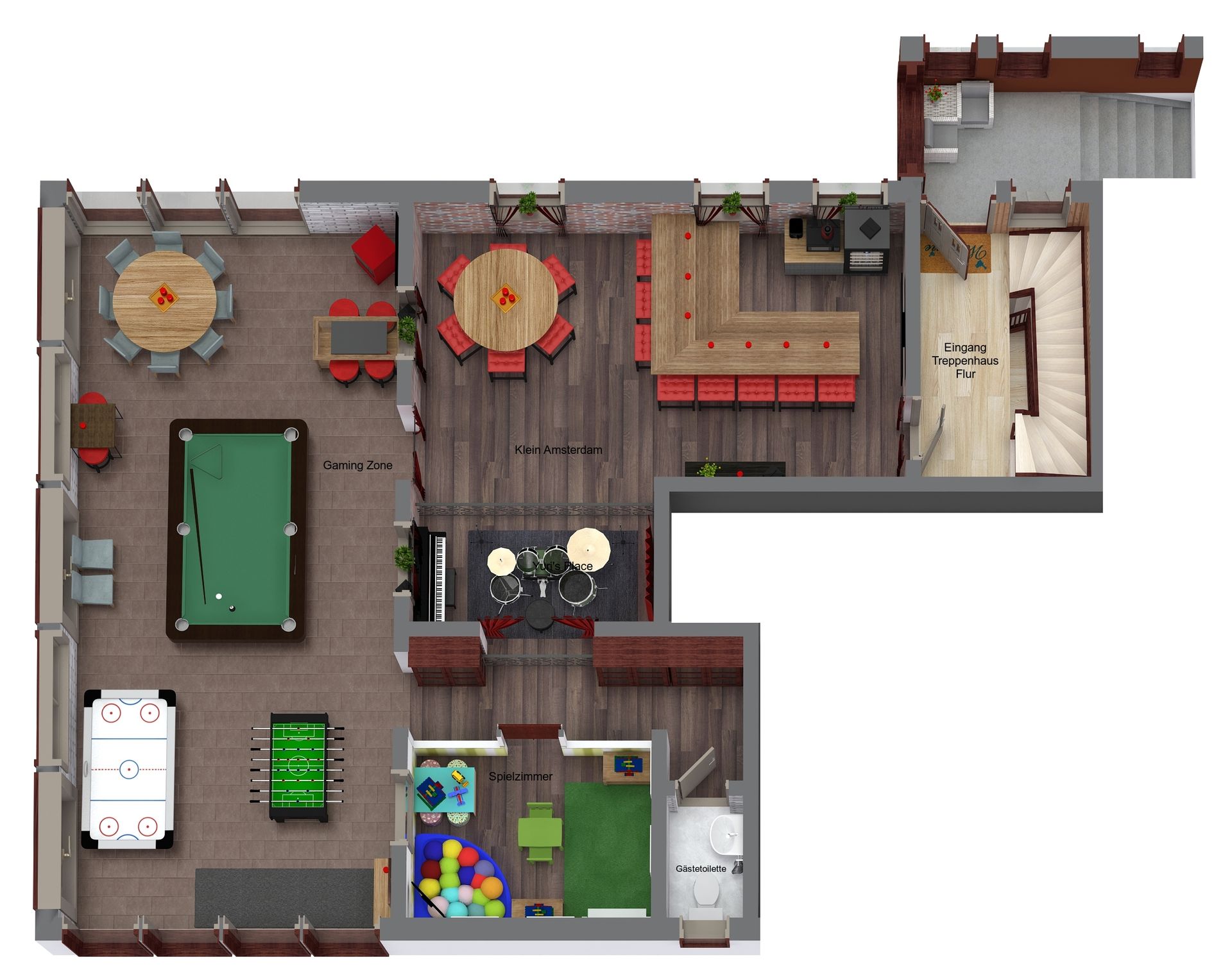 Anschließend an Klein Amsterdam befindet sich unsere Gaming Zone. Diese ist ausgestattet mit: